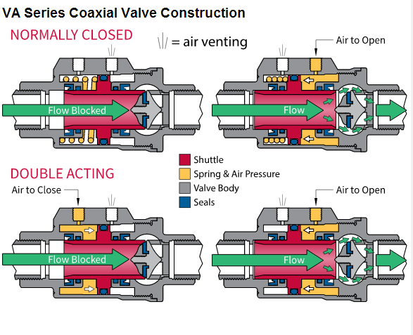 閥2同軸的位置,閥可以是氣動或電動地驅(qū)動。電動版本使用電磁線圈和彈簧,類似于螺線管閥。該版本使用氣動空氣壓力和彈簧(彈簧復(fù)位),或空氣壓力在兩個方向(雙向)。使用同軸閥往復(fù)型障礙物,穿過介質(zhì)時打開。該傳送裝置移動到一個位置或另一個來執(zhí)行其功能,或者開/關(guān)或分流流量到適當(dāng)?shù)某隹?。同軸閥(10)具有更大的流動通道的電磁閥相比,但仍然沒有完全的閥端口。那是真的,又有一個限制流量和壓力損失的增加。有風(fēng)格多樣的同軸閥。兩個例子是VA系列氣動操作閥的開/關(guān)VAX系列電動或氣動同軸閥可在2-3開/關(guān)方式或雙向分流。對于許多應(yīng)用同軸ON/OFF閥使代替球形閥。同軸閥將提供較小的閥更快操作的球閥將典型地具有較高的流速與壓降較低。